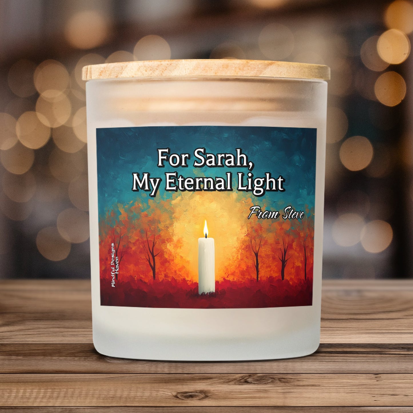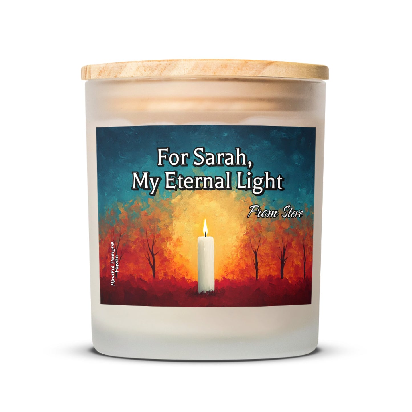 Product info: Coconut soy wax, wood wick, frosted glass vessel, and maple wood lid.