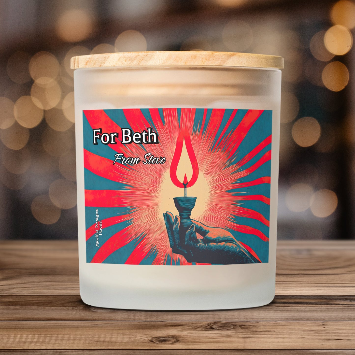 Product info: Coconut soy wax, wood wick, frosted glass vessel, and maple wood lid.